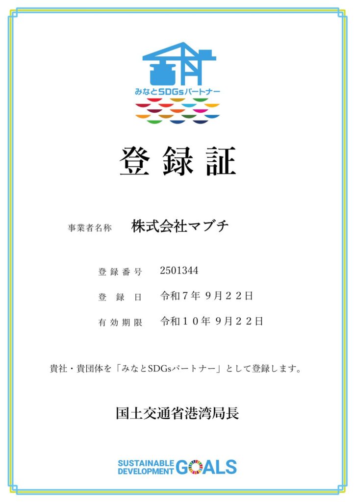 株式会社マブチは、国土交通省港湾局の「みなとSDGsパートナー登録制度」において登録企業として認定を受けておりますが、このたび3年ごとの更新が認められ、引き続き「みなとSDGsパートナー」として登録されましたのでお知らせいたします。